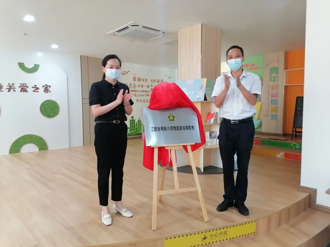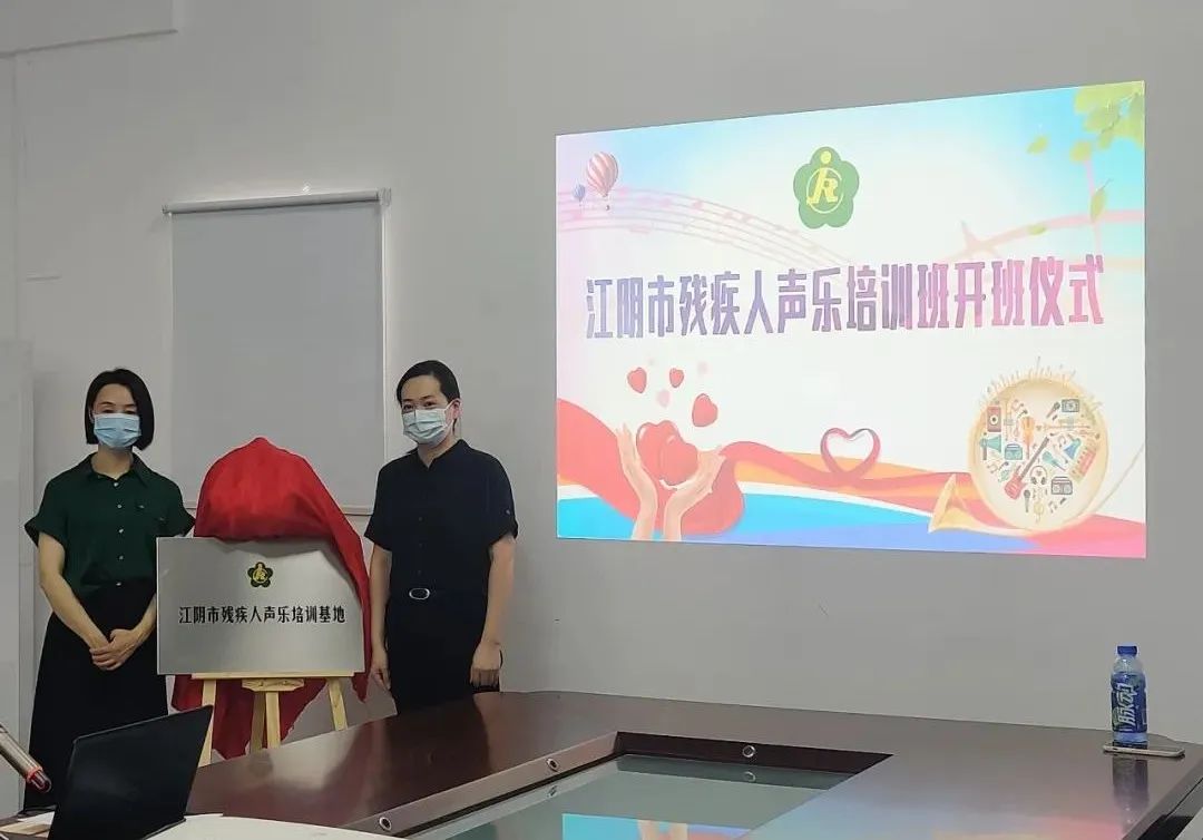 ▲唐卫娟、金莉共同为“江阴市残疾人声乐培训基地”揭牌
